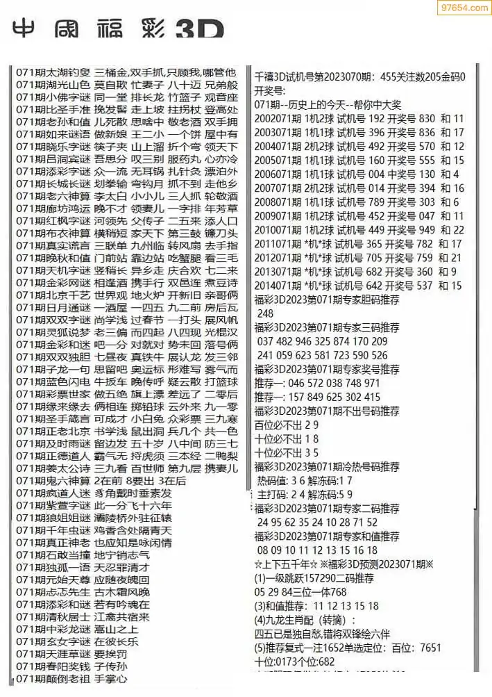 福彩3D071期天牛彩吧套图整合总汇