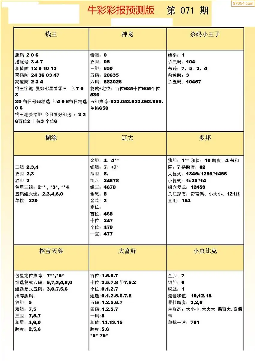 071期3D牛彩预测报+彩吧字谜报