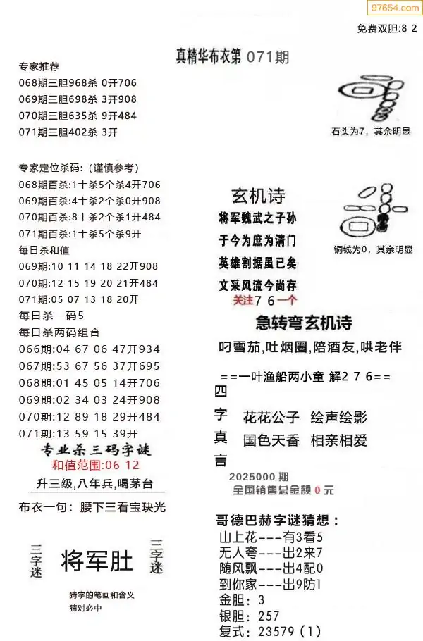 071期真版布衣神算专家推荐
