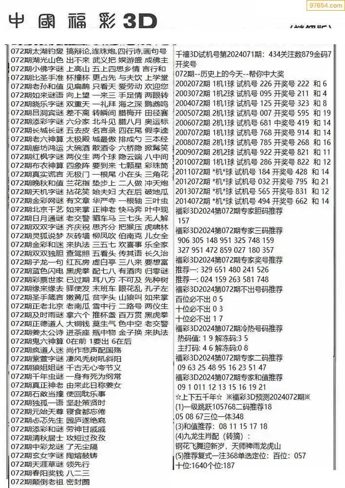 福彩3D072期天牛彩吧套图整合总汇