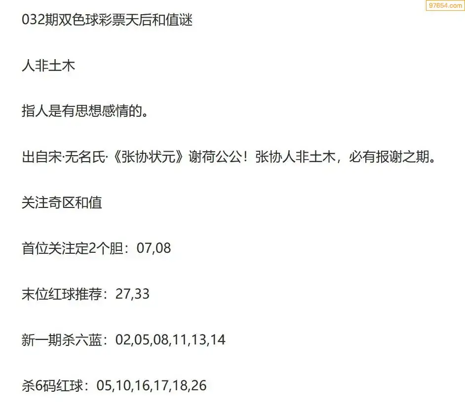 彩票天后双色球26年032期今日和值谜