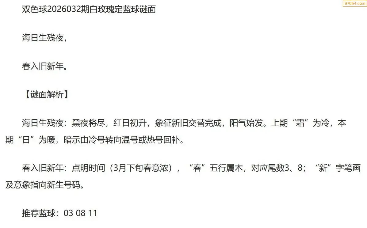 白玫瑰双色球26年032期定蓝球字谜