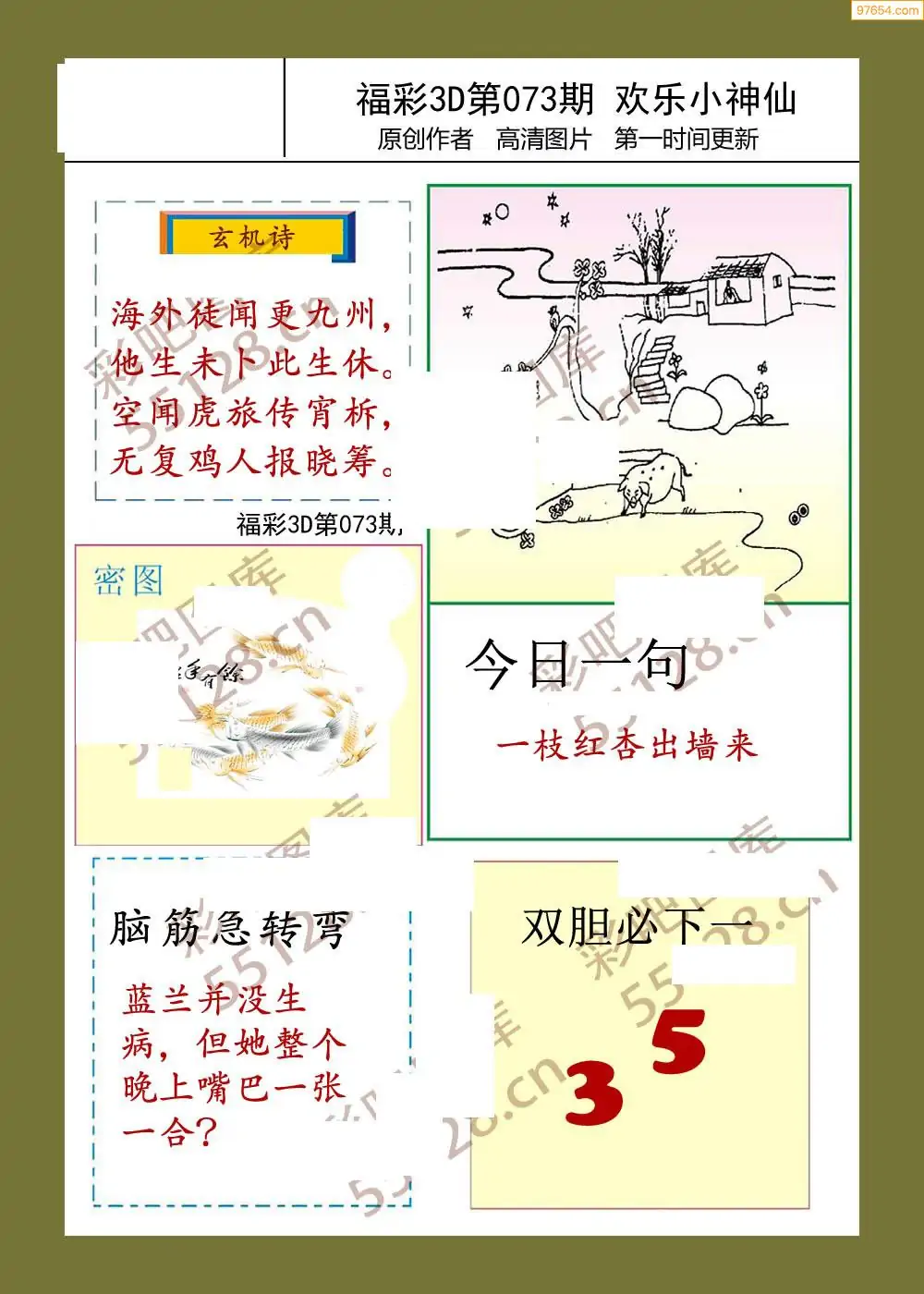 福彩3D26073期蓝仙子一句定三码图谜