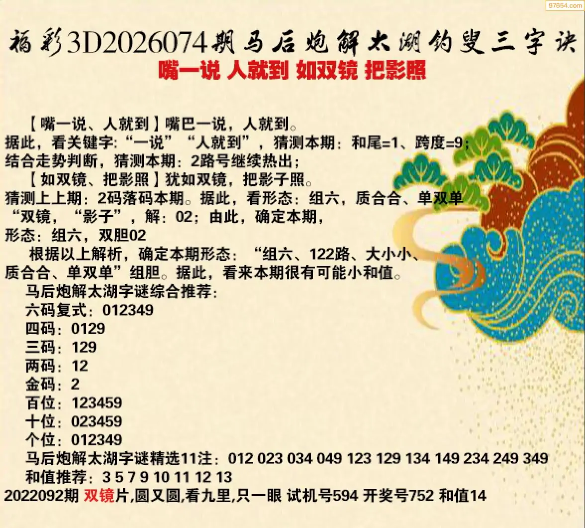 福彩3d26年074期神采飞扬星解太湖三字决