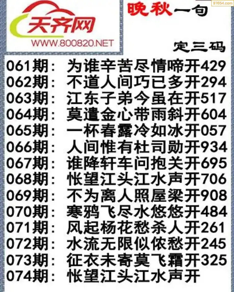 074期3d福彩今日晚秋字谜一句定三码