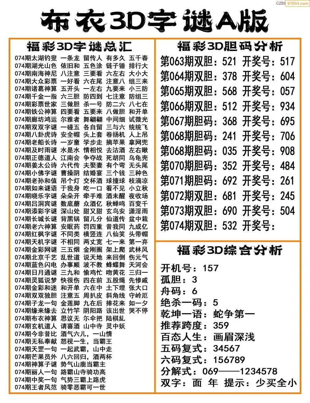 福彩074期3d真精华布衣+布衣早报(转载)