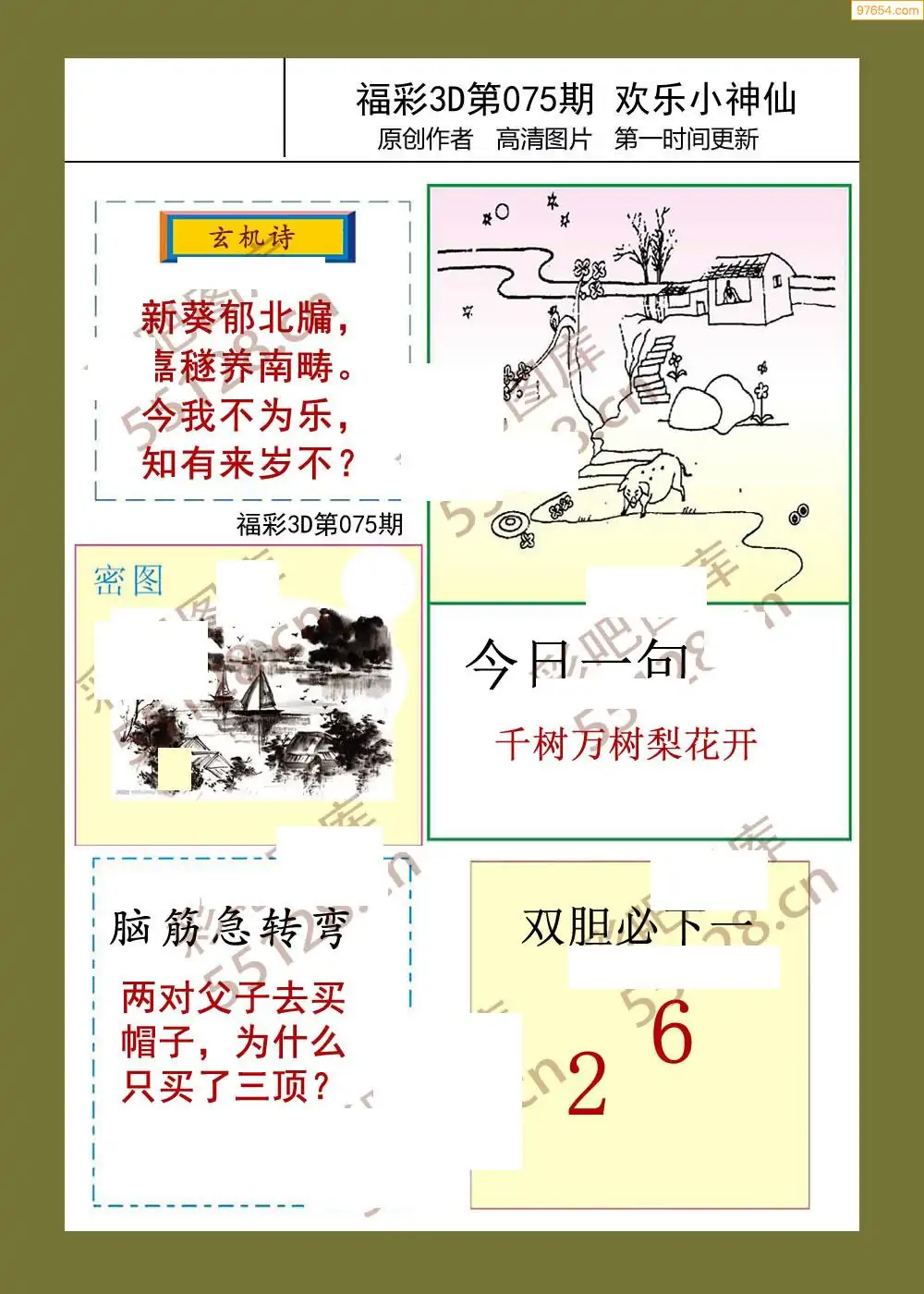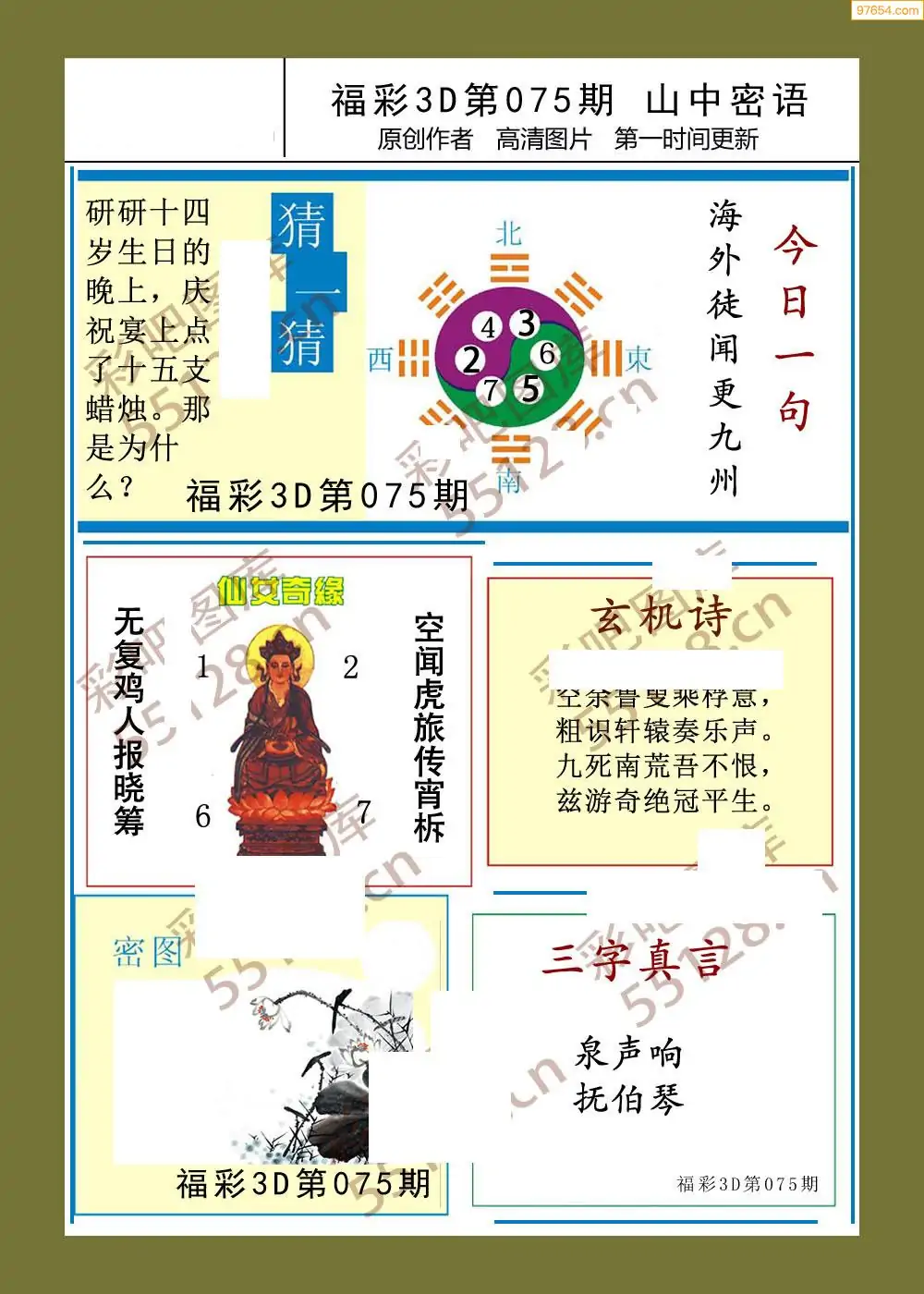 福彩3D26075期蓝仙子一句定三码图谜