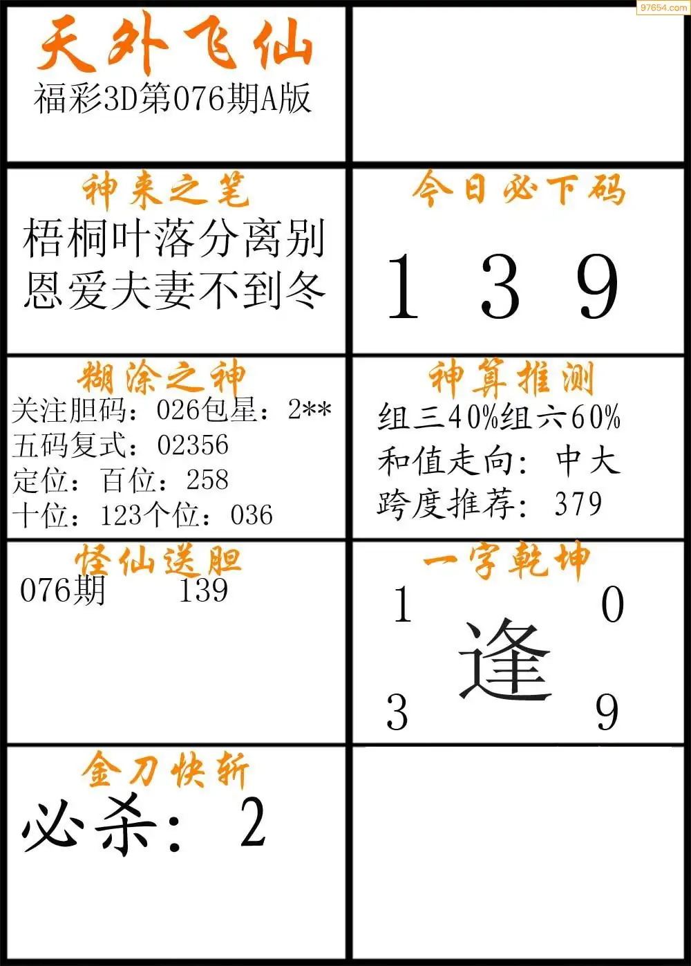 076期福彩3d天外飞仙A版