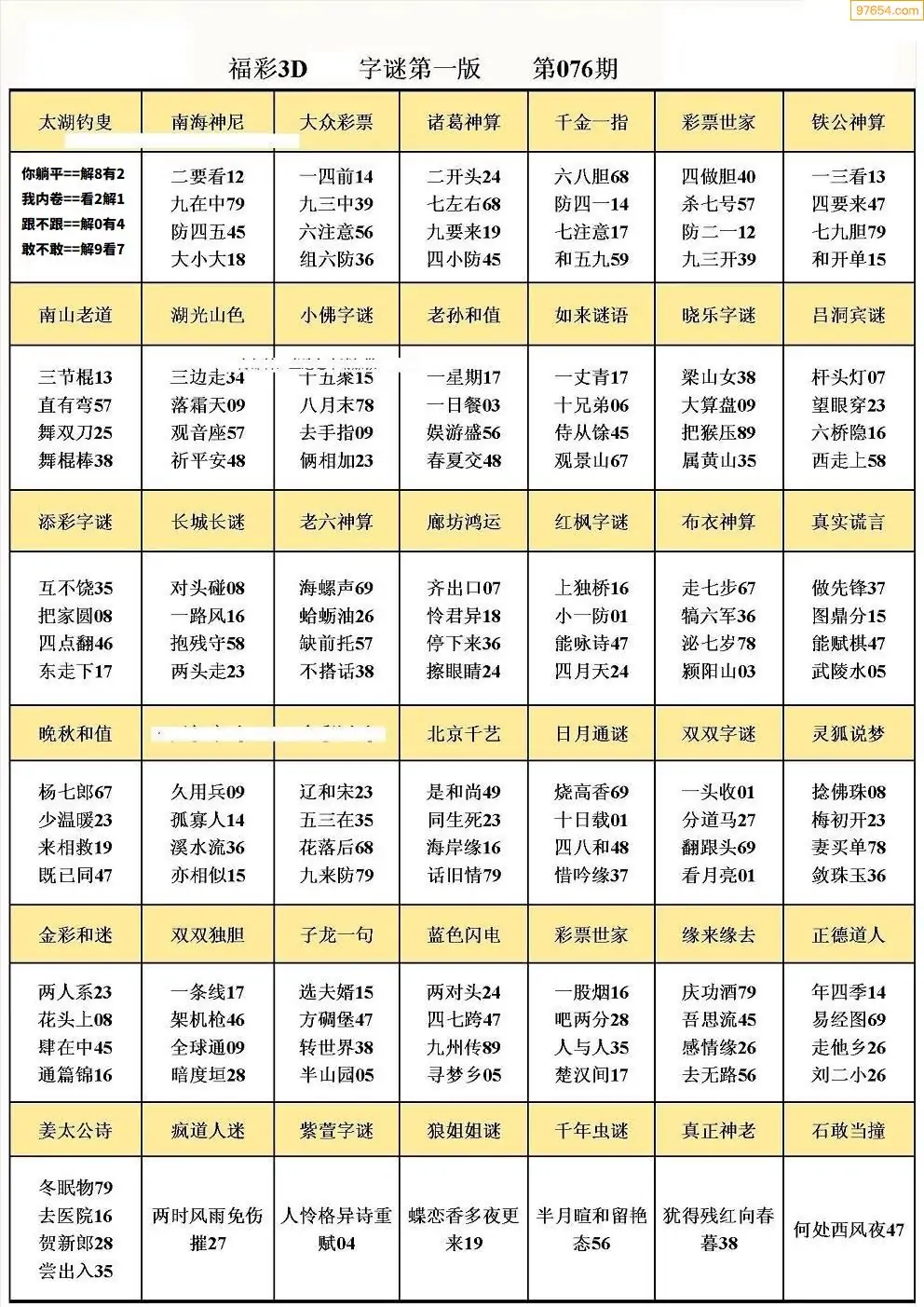 076期3D牛彩预测报+彩吧字谜报