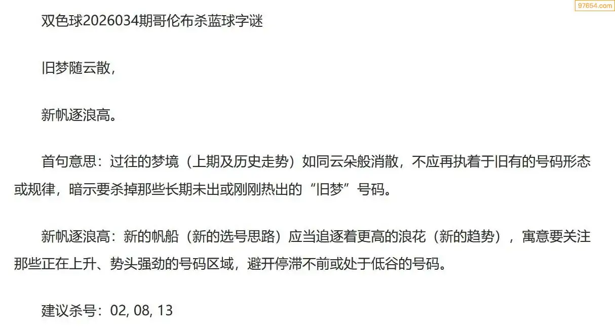 哥伦布双色球26年034期一句杀蓝球字迷
