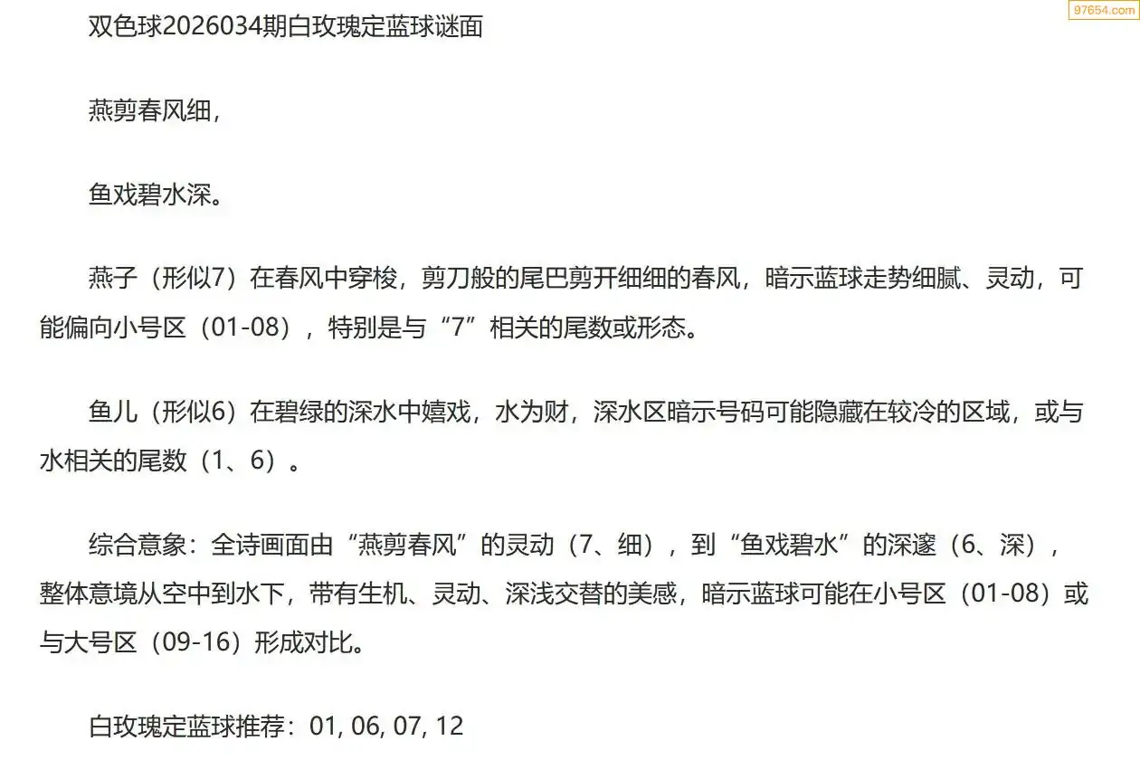 白玫瑰双色球26年034期定蓝球字谜
