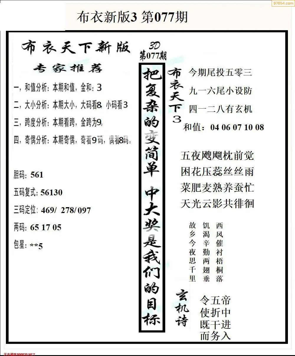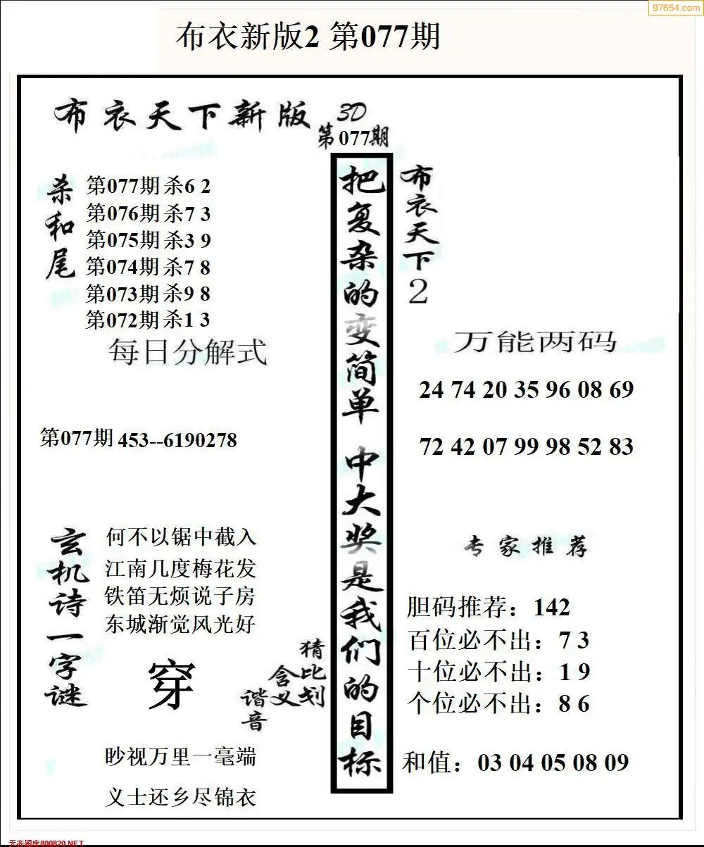 福彩077期3d真精华布衣+布衣早报(转载)