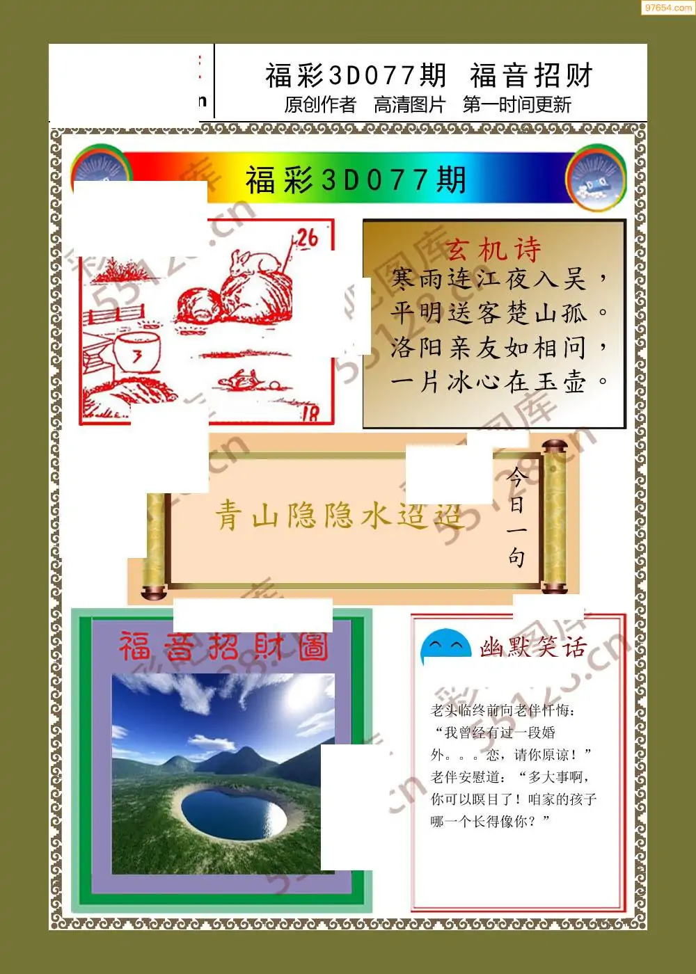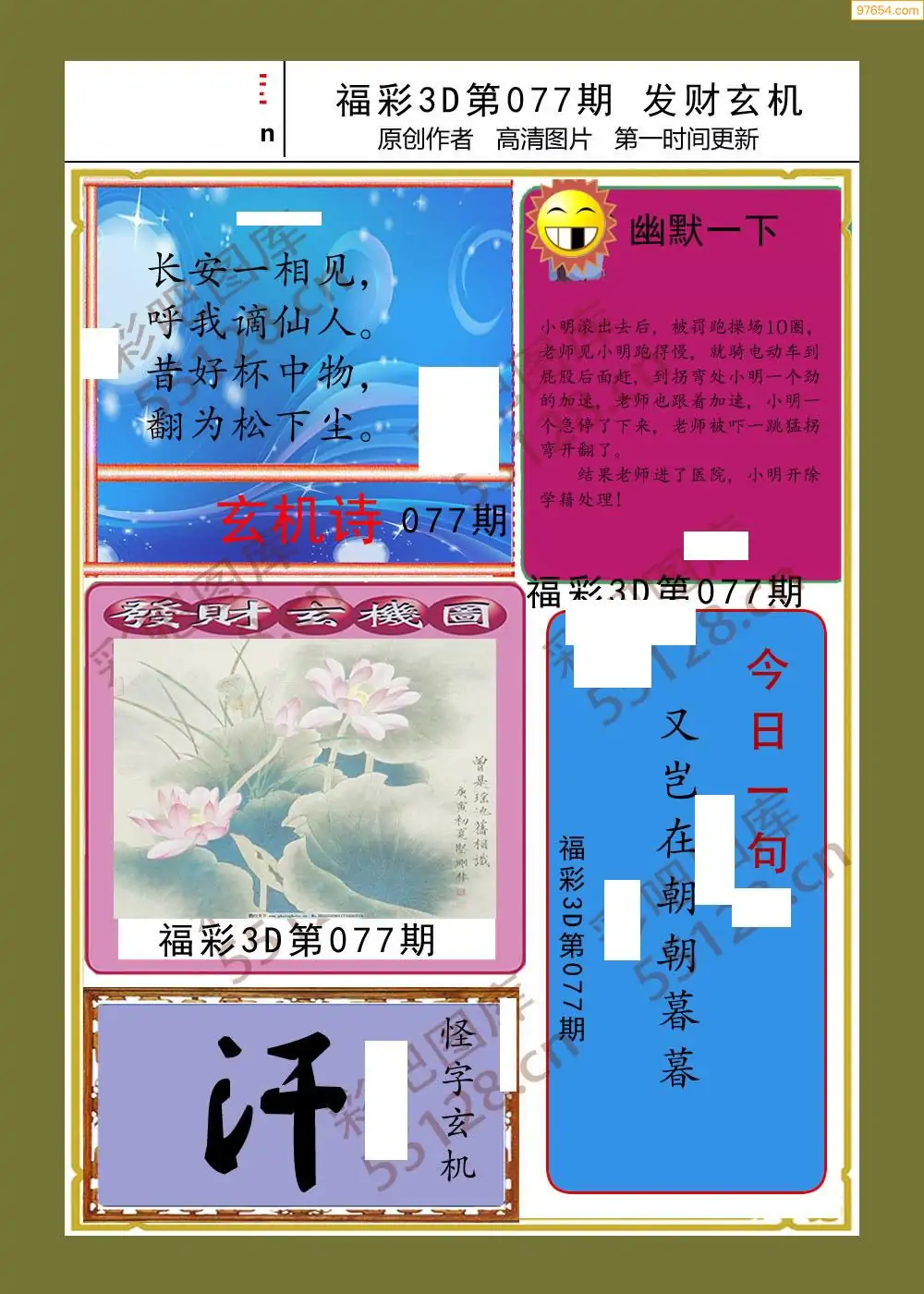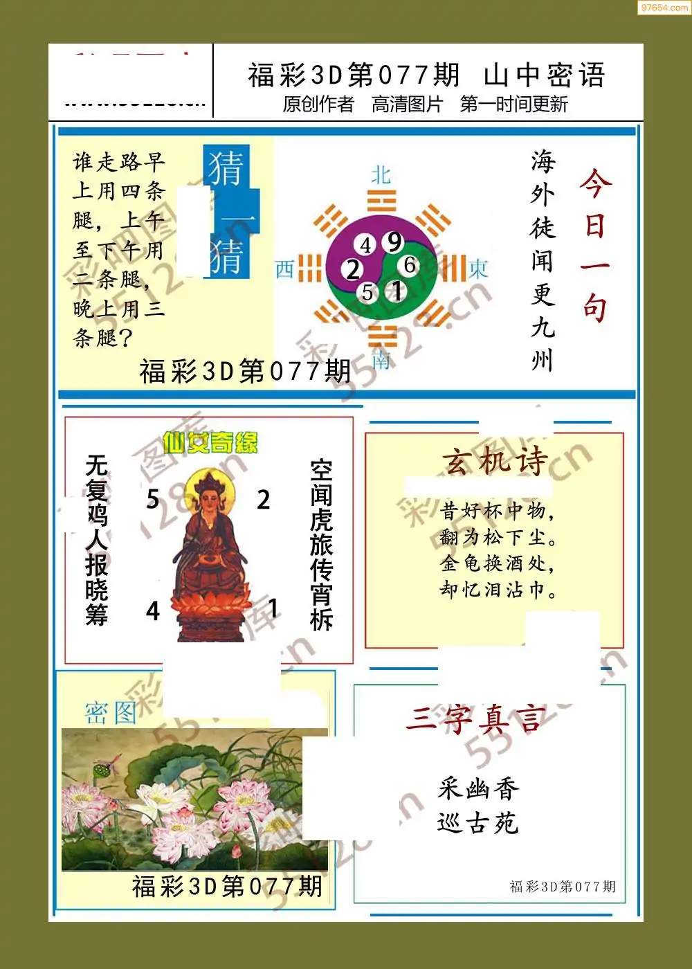 福彩3D26077期蓝仙子一句定三码图谜