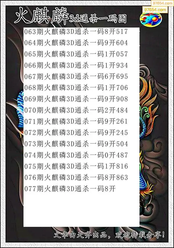 2026076期福彩火麒麟杀码图