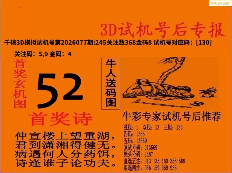 26077期福彩3D试机号后首奖诗