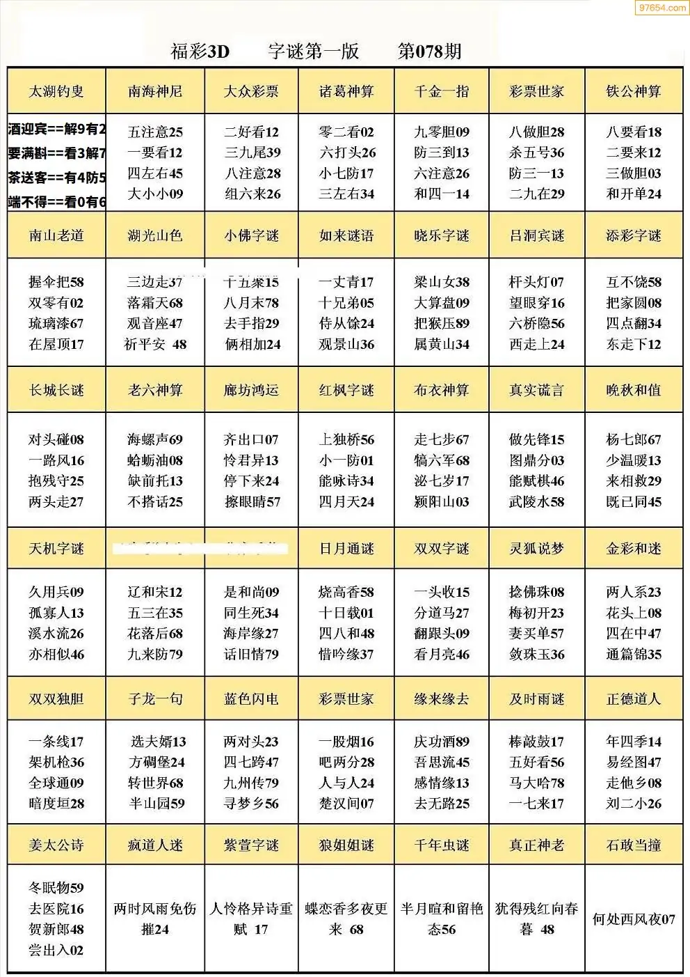 078期3D牛彩预测报+彩吧字谜报