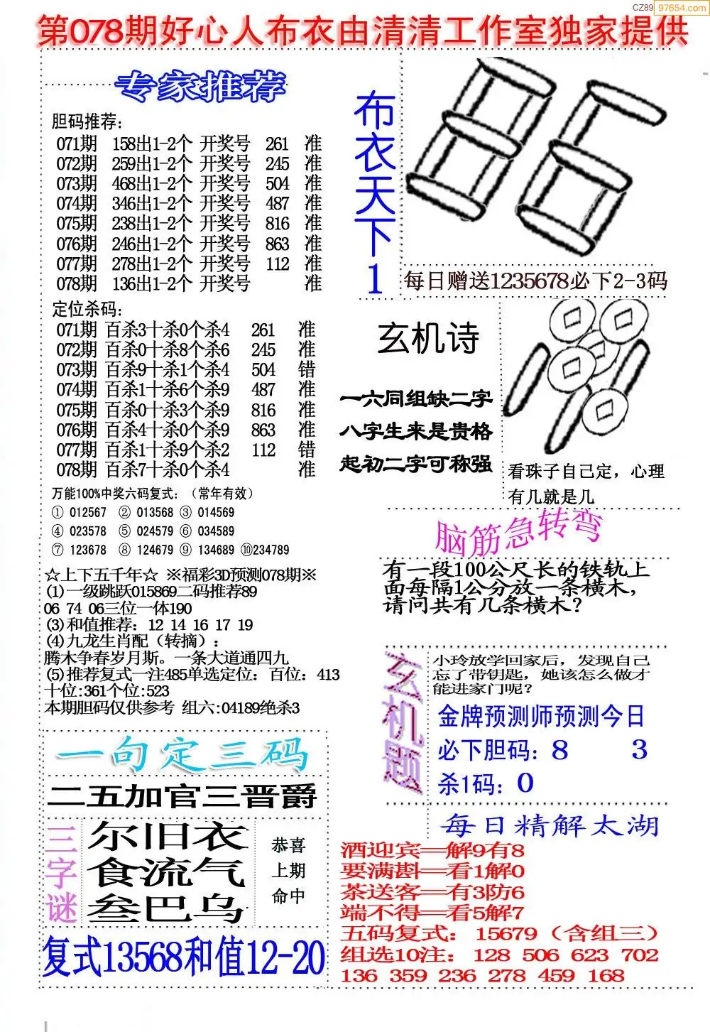 福彩078期3d真精华布衣+布衣早报(转载)