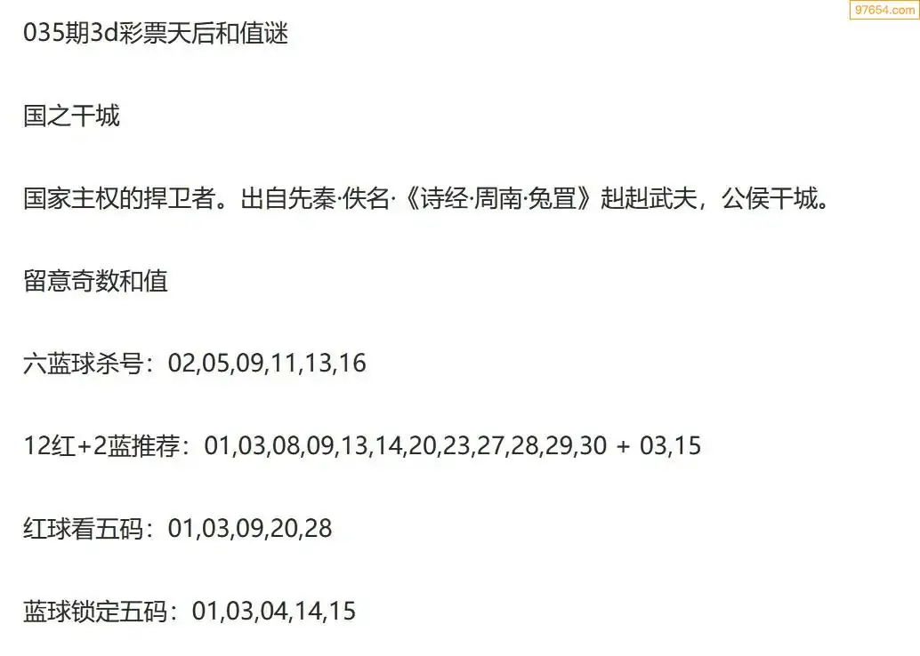 彩票天后双色球26年035期今日和值谜