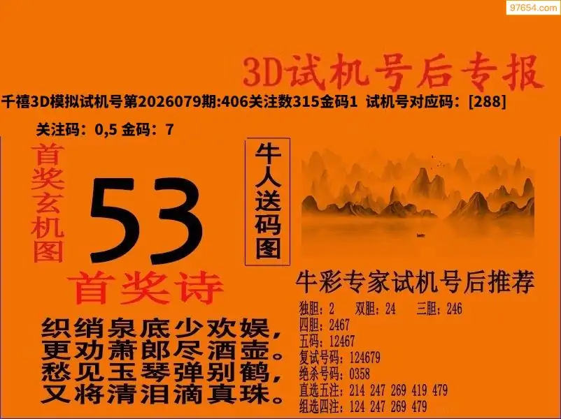 26079期福彩3D试机号后首奖诗