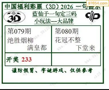 福彩3D26080期蓝仙子一句定三码图谜