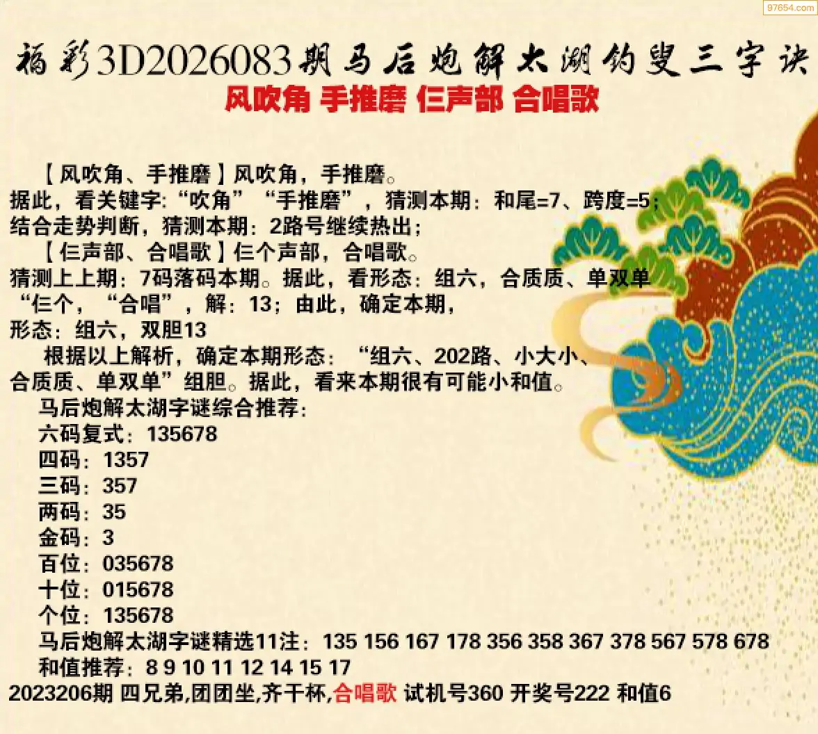 26年083期马后炮解3d太湖钓叟之 仨声部