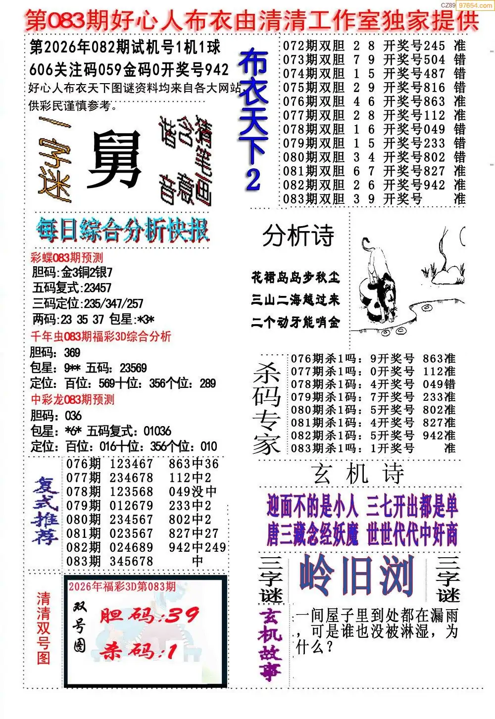 福彩26083期布衣3d字谜ab