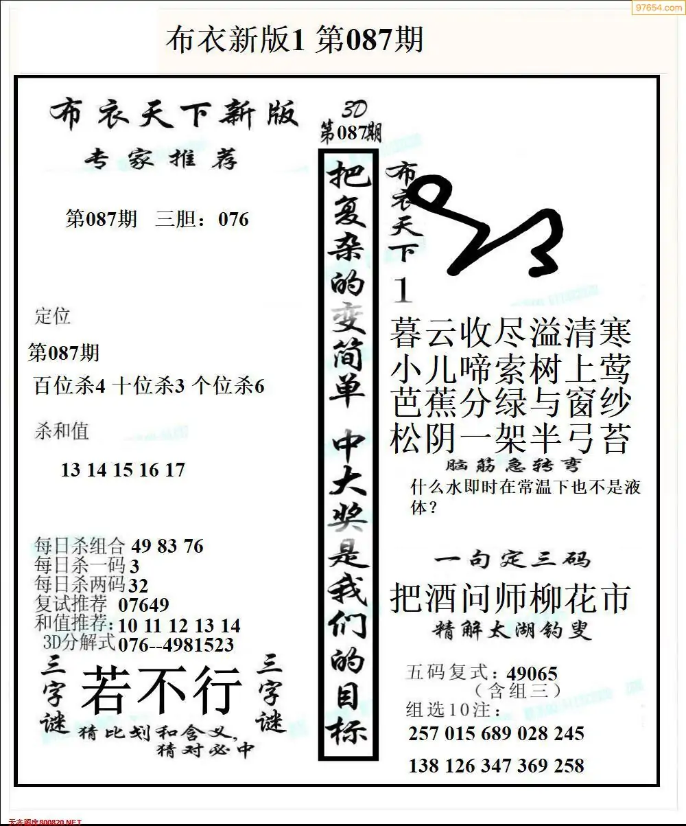 福彩087期3d真精华布衣+布衣早报(转载)