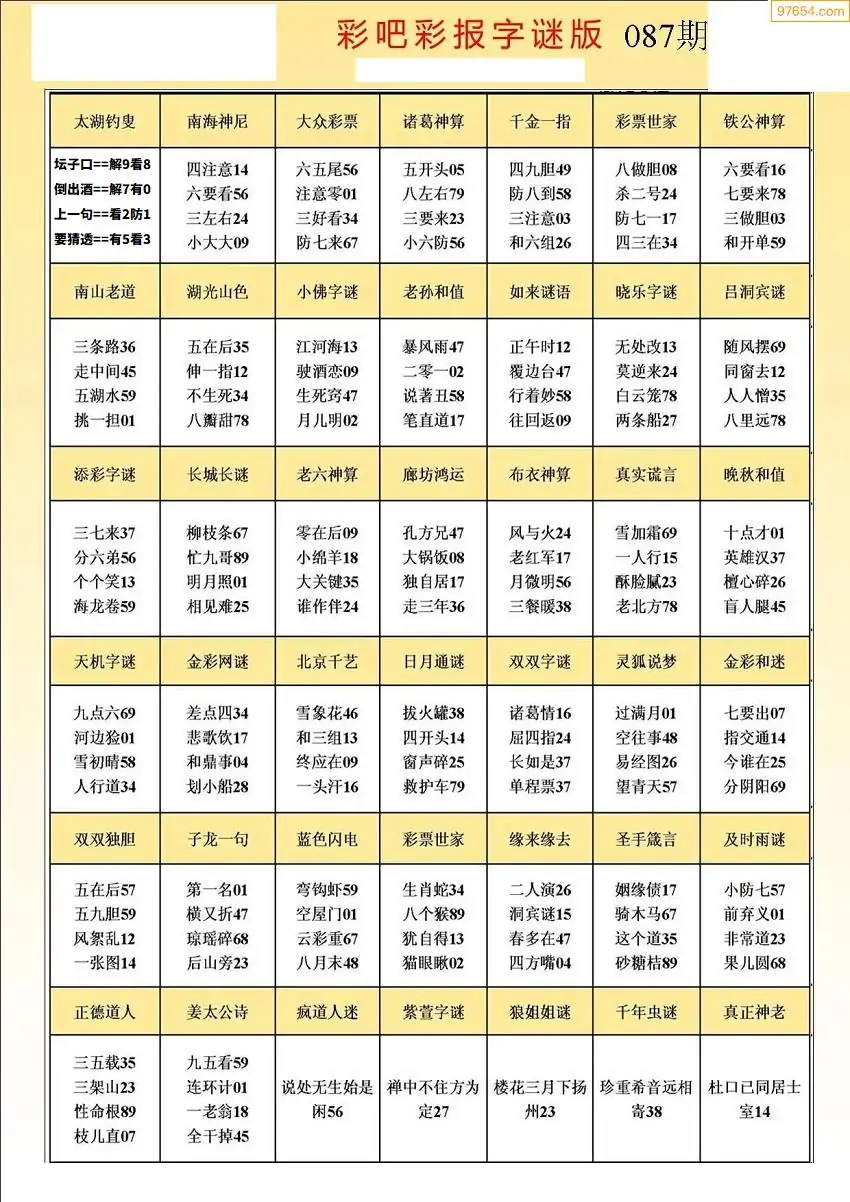 087期3D牛彩预测报+彩吧字谜报