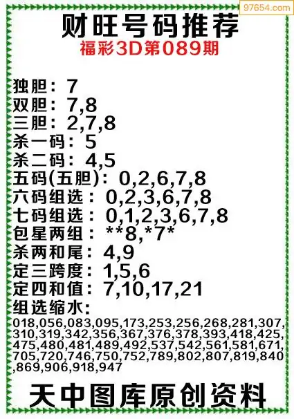 3D原创089期旺财出号推荐