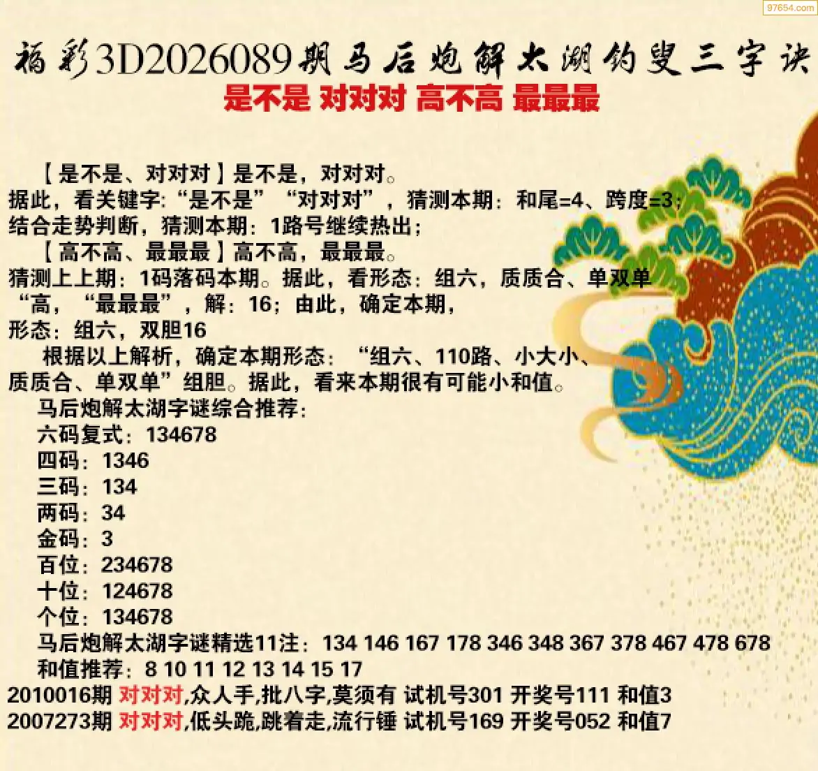 26年089期马后炮解3d太湖钓叟之 对对对
