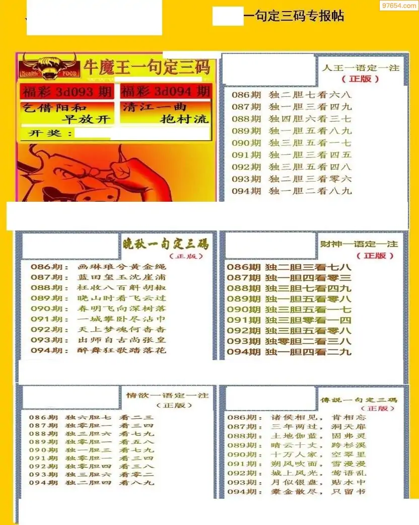 094期3D牛彩预测报+彩吧字谜报