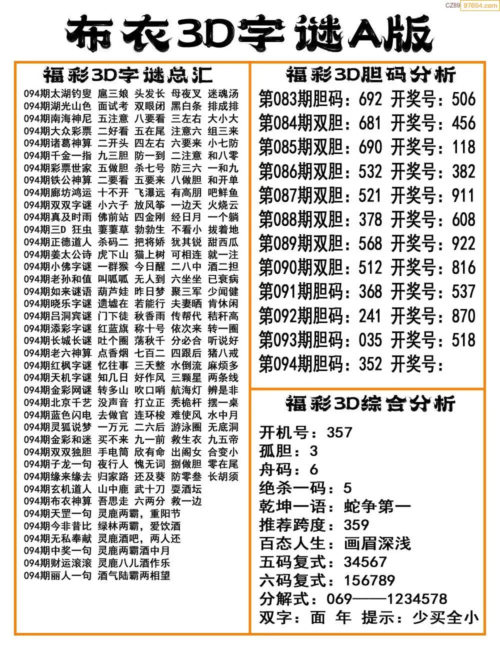 福彩26094期布衣3d字谜ab