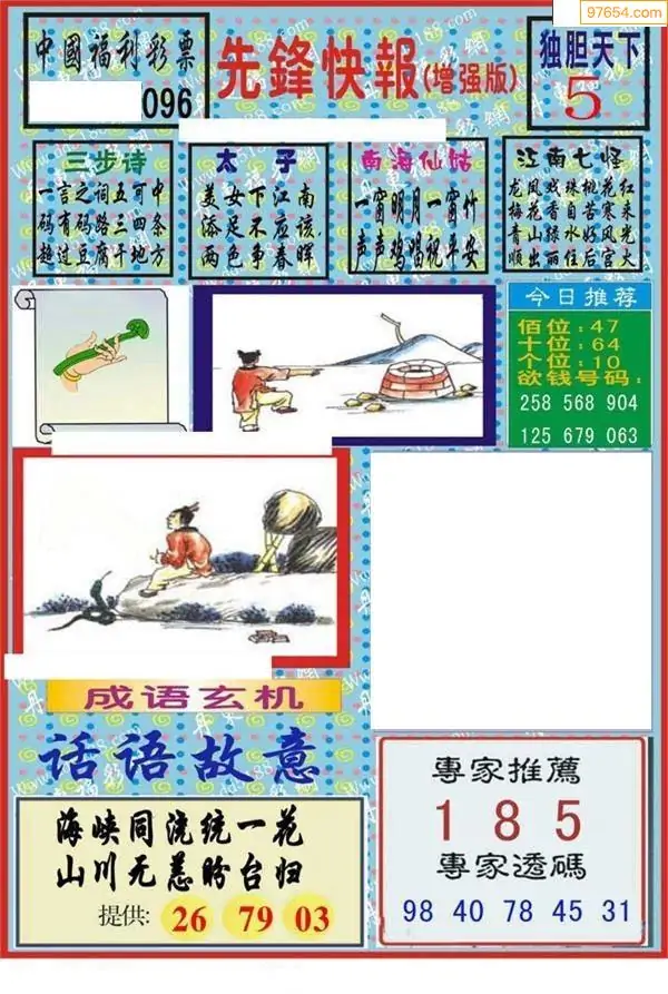 福彩3D26096期蓝仙子一句定三码图谜