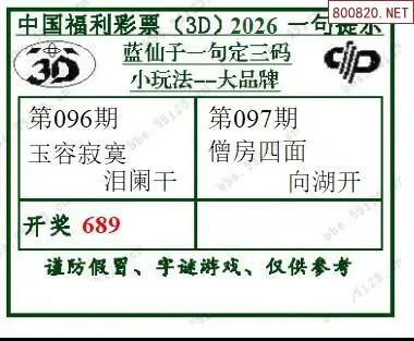 福彩3D26097期蓝仙子一句定三码图谜