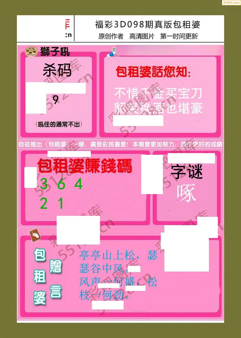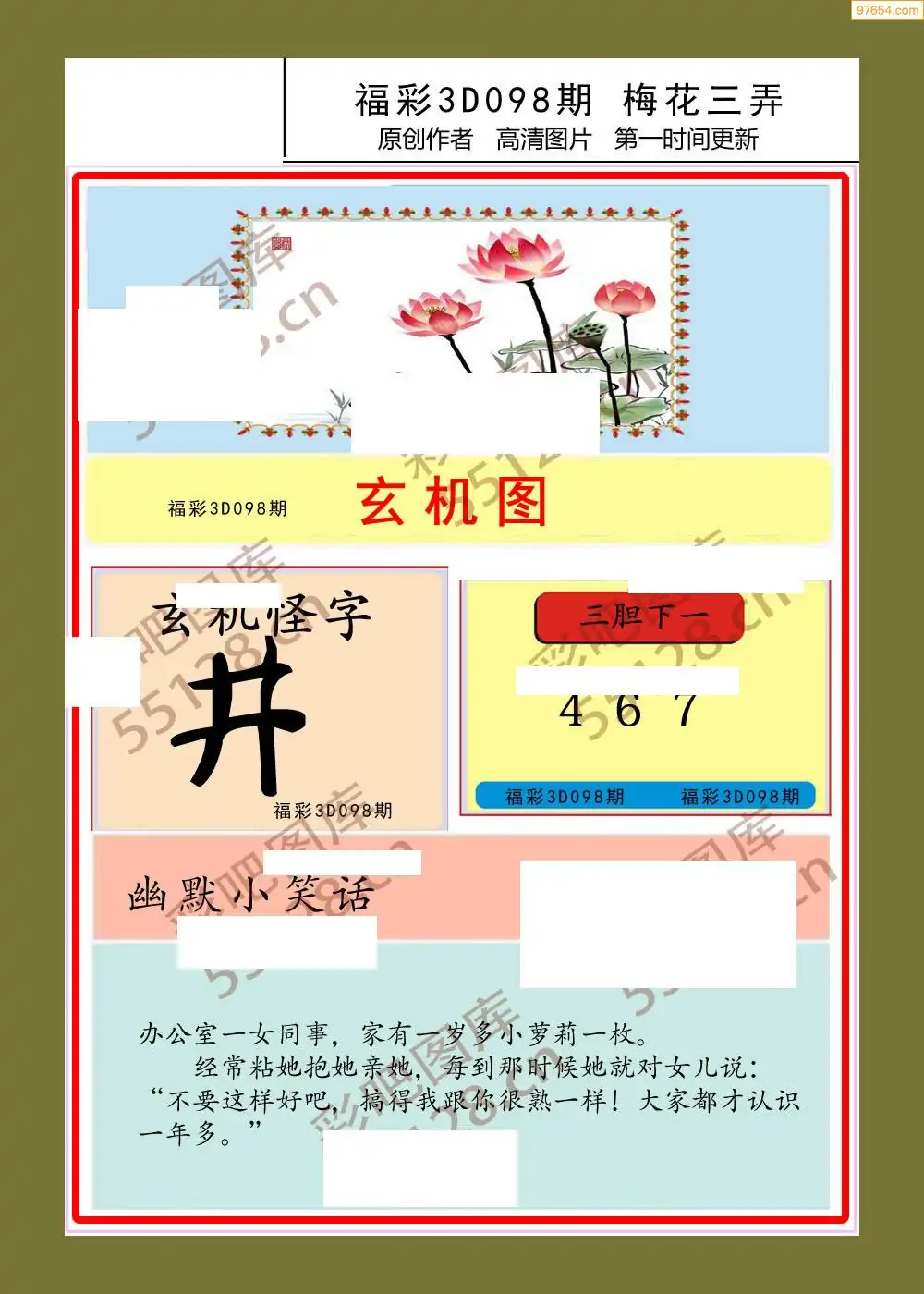 福彩3D26098期蓝仙子一句定三码图谜