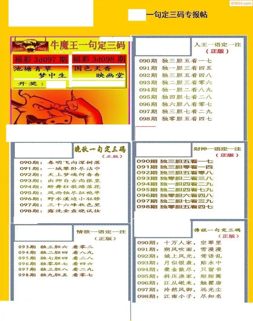 098期3D牛彩预测报+彩吧字谜报