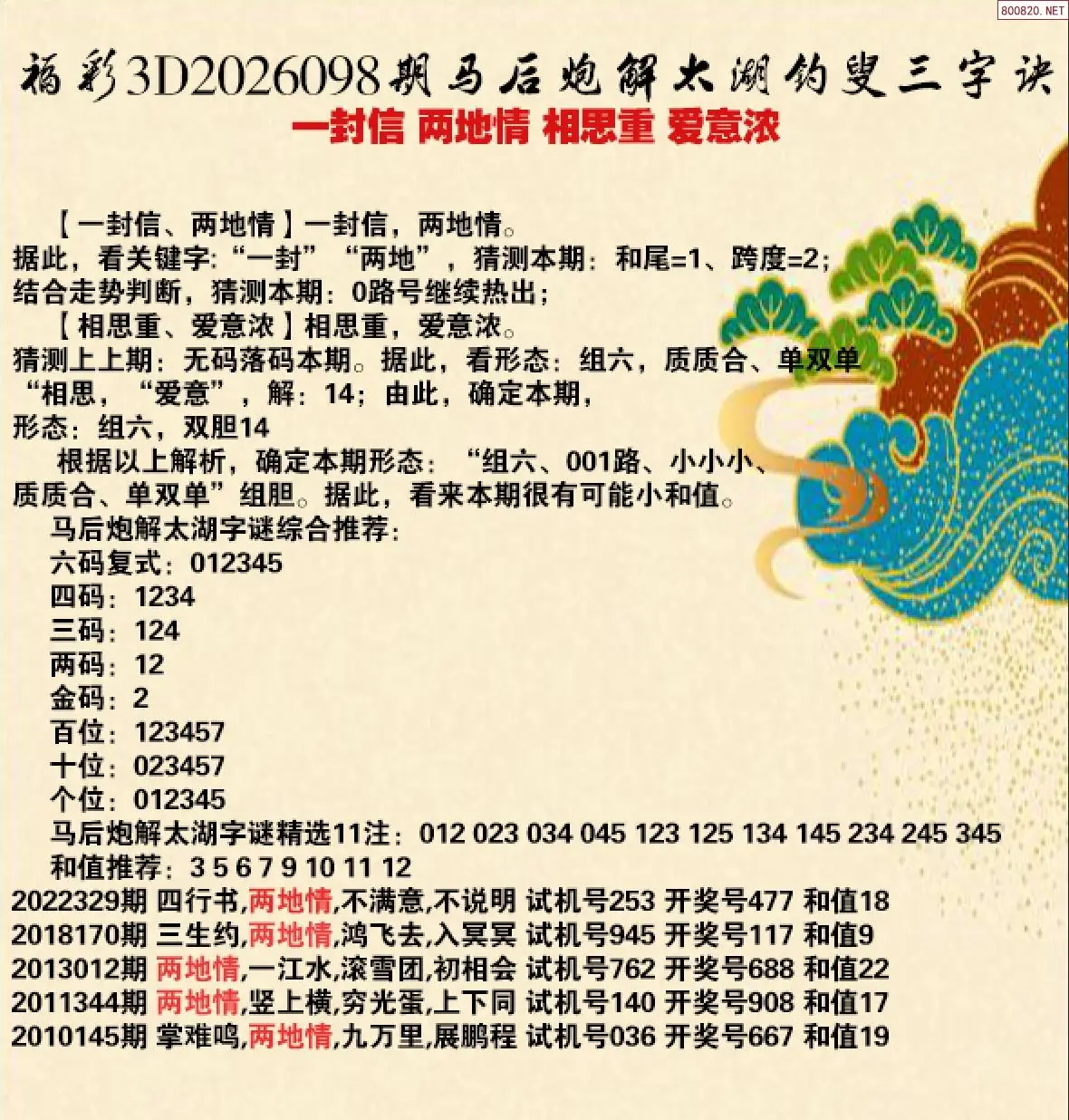 26年098期马后炮解3d太湖钓叟之 两地情