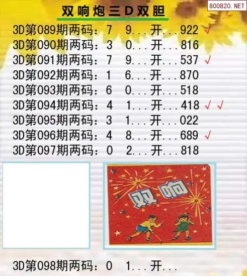 098期双响炮三D双胆分析