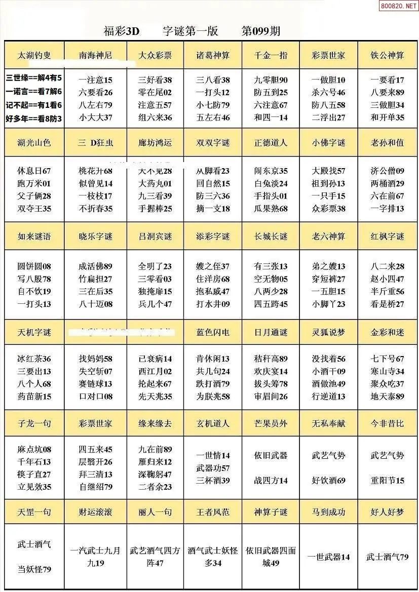 099期3D牛彩预测报+彩吧字谜报