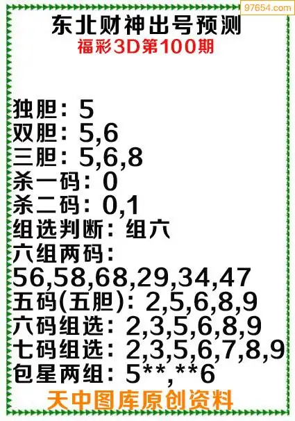 3d原创100期东北财神预测