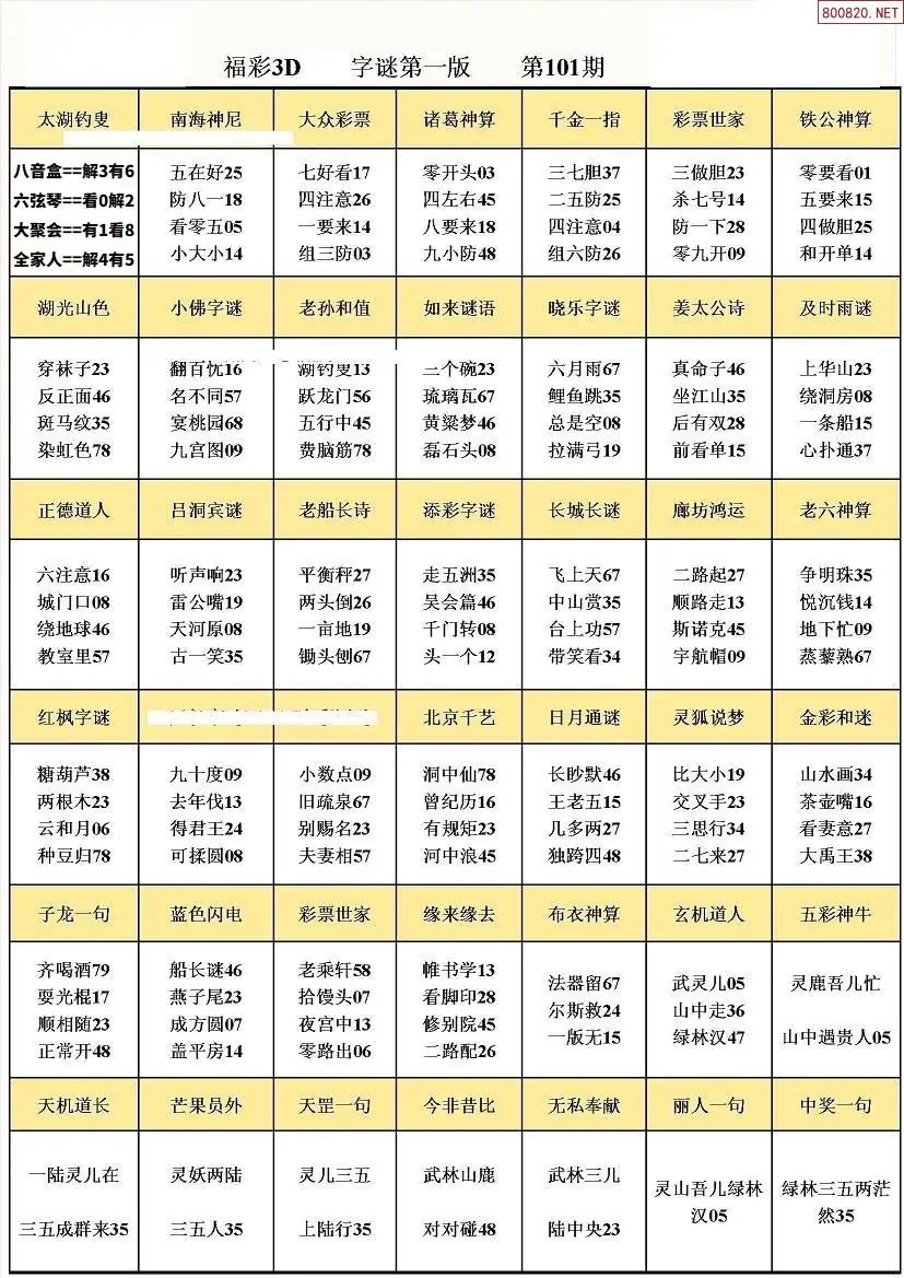 101期3D牛彩预测报+彩吧字谜报