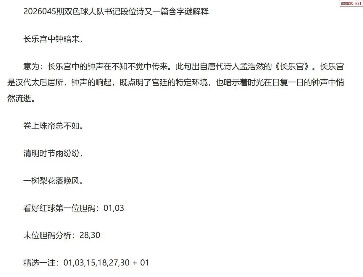 大队书记双色球26年045期段位诗谜