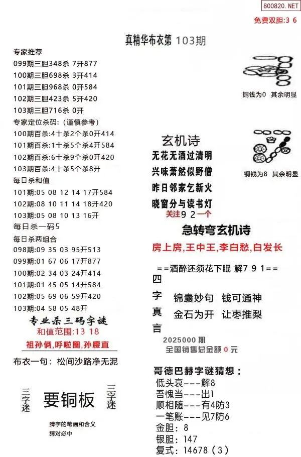 (9)26年103期当期全站杀号定胆图
