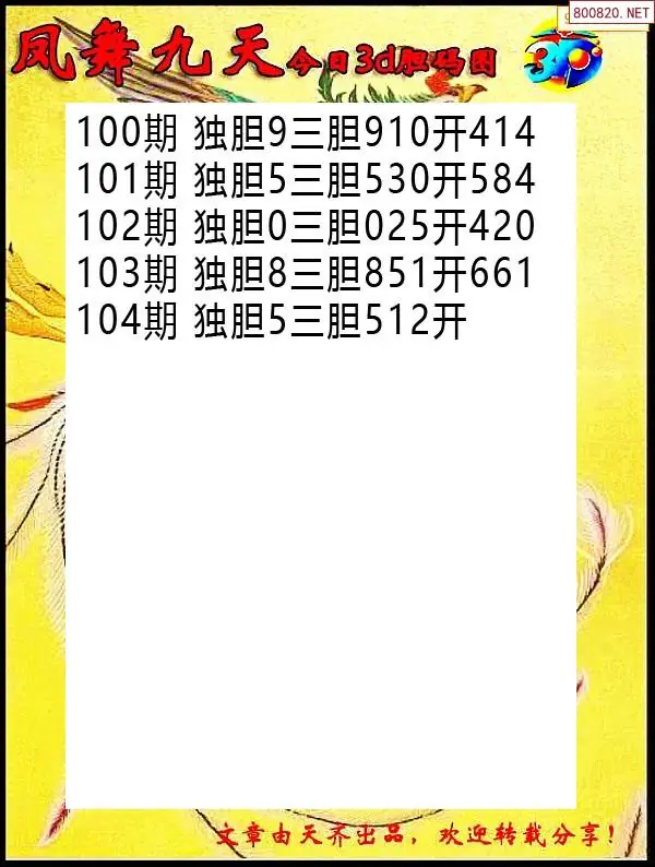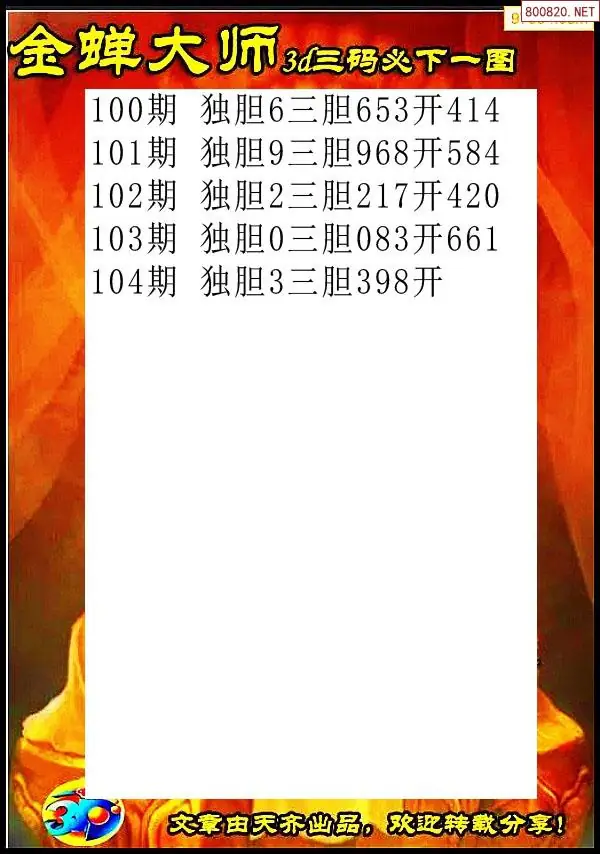 天齐网3d26年104期胆码图 胆:78
