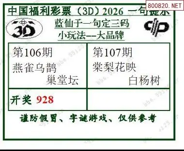 福彩3D26107期蓝仙子一句定三码图谜