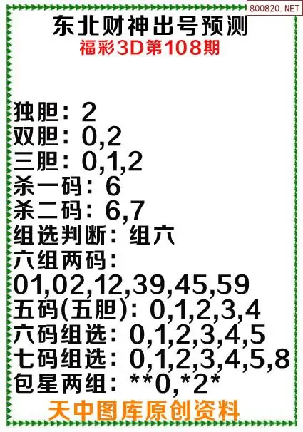 3d原创108期东北财神预测