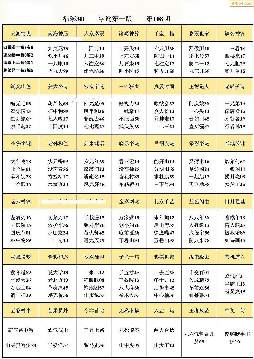 108期3D牛彩预测报+彩吧字谜报