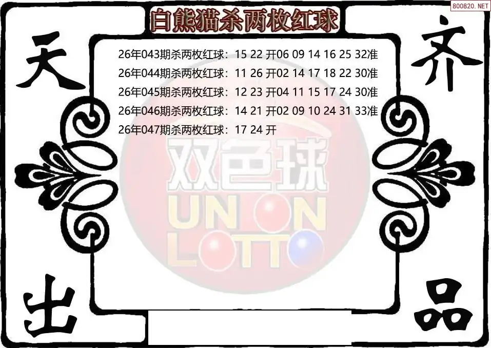 26年双色球047期白熊猫杀两枚红球图谜