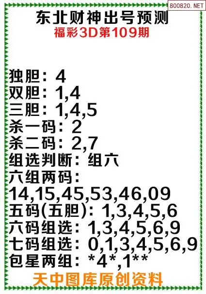 3d原创109期东北财神预测