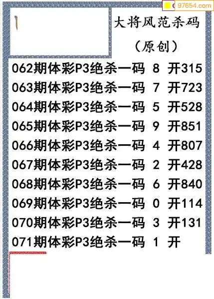 26年071期大将风范p3杀码体彩图谜